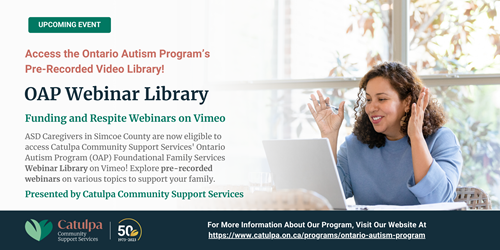 OAP Funding & Reconciliation · Navigating Respite Care · Special Services At Home (SSAH) Funding · Jordan’s Principle Funding · Easter Seals Funding · Assistance for Children with Severe Disabilities (ACSD) Funding You are welcome to register to receive your link! Catulpa's OAP Foundational Family Services are offering Pre-Recorded Webinars for your convenience. Thank you for your interest! Register with your child's OAP number and age range (0-5 or 6-17) to receive the Vimeo link and password to view our library. Event details: Dates: February 3rd, 2025 March 3rd, 2025 April 1st, 2025 May 7, 2025 June 5th, 2025 Time: At your convenience! For more information and to register, click here